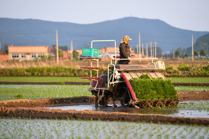 在吉林省吉林市永吉縣鑫豐種植農民專業合作社,農民駕駛農機進行水稻插秧(2025年5月26日攝)。新華社記者 張楠 攝