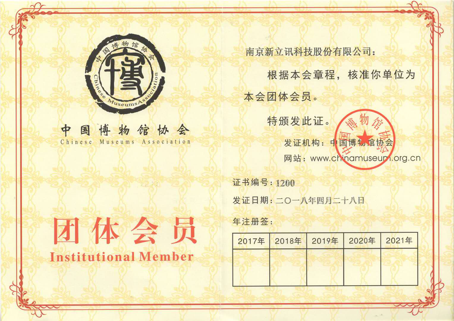 2018年4月28日,在多家博物館的聯合推薦下,中國博物館協會正式核準南京新立訊科技股份有限公司成為該協會團體會員單位,并頒發團體會員證書。
