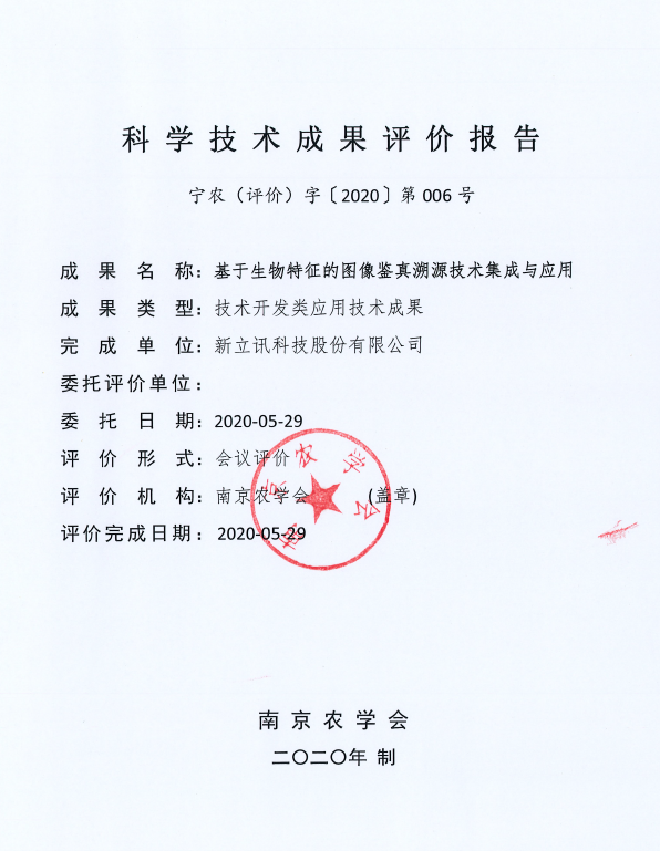 近日,新立訊科技股份有限公司自主研發(fā)的基于AI生物特征的圖像鑒真溯源技術(shù)集成與應(yīng)用取得由專業(yè)評審機構(gòu)南京農(nóng)學(xué)會組織的《科學(xué)技術(shù)成果評價》,技術(shù)先進性達國內(nèi)外領(lǐng)先水平。