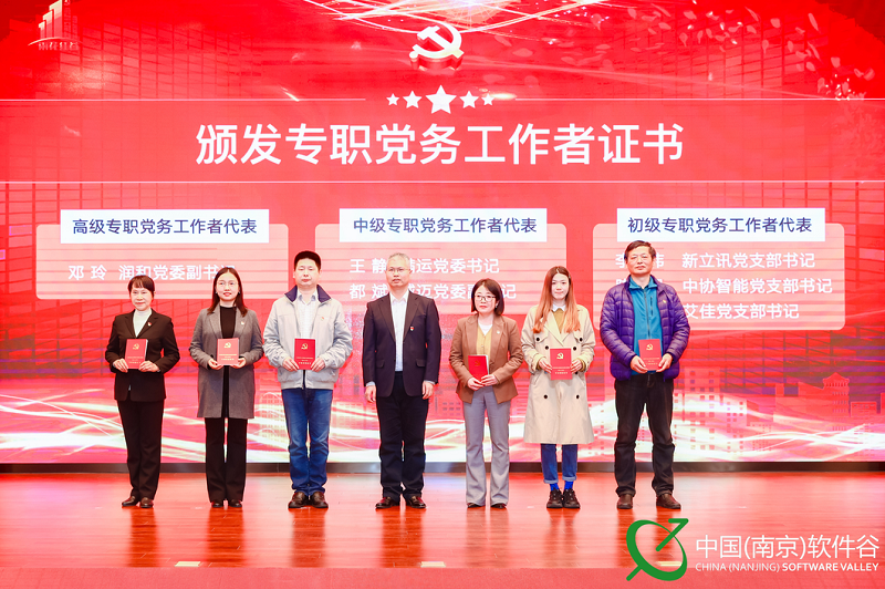 雨花臺區委組織部常務副部長夏風為“兩新”組織黨務工作者代表頒發證書,新立訊黨支部書記李偉榮獲“初級專職黨務工作者代表”稱號。