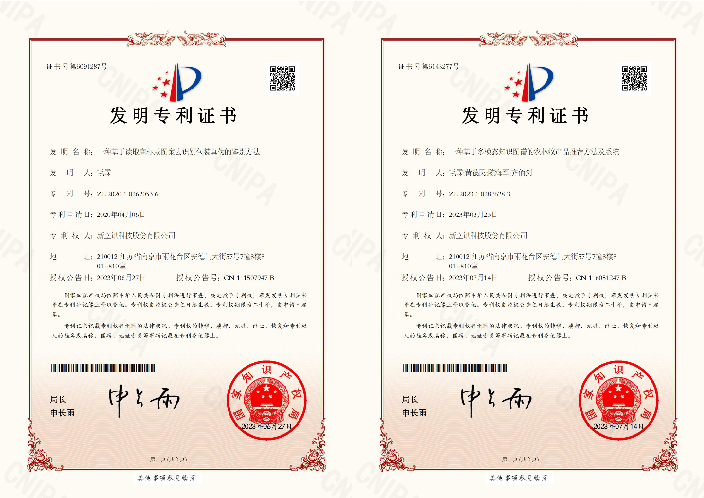 7月,新立訊知識(shí)產(chǎn)權(quán)領(lǐng)域再獲兩項(xiàng)發(fā)明專利,分別是“一種基于讀取商標(biāo)或圖案去識(shí)別包裝真?zhèn)蔚蔫b別方法”(專利號(hào):ZL202010262053.6),“一種基于多模態(tài)知識(shí)圖譜的農(nóng)林牧產(chǎn)品推薦方法及系統(tǒng)”(專利號(hào):ZL202310287628.3)均為我司原始取得,是技術(shù)創(chuàng)新和研發(fā)方面取得的重要成果。